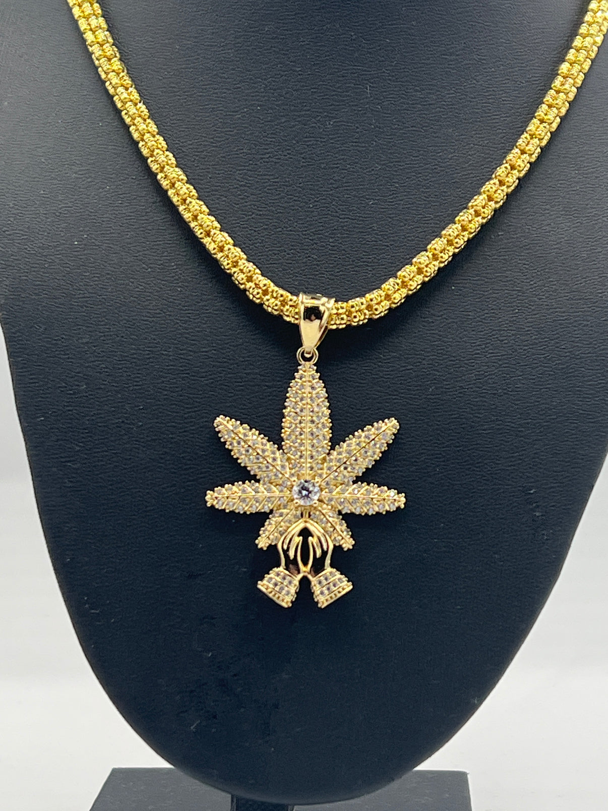 Gold Over Silver Marijuana Praying Hip-Hop Pendant with CZ