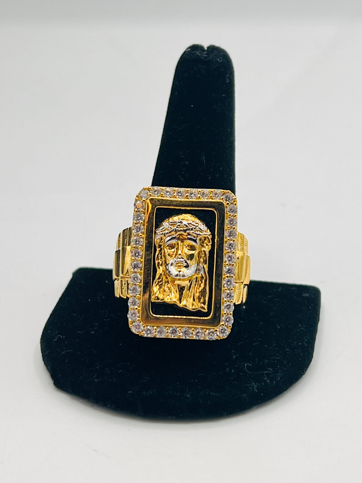 Gold Over Silver Square Jesus Portrait Ring for Mens' w/ CZ